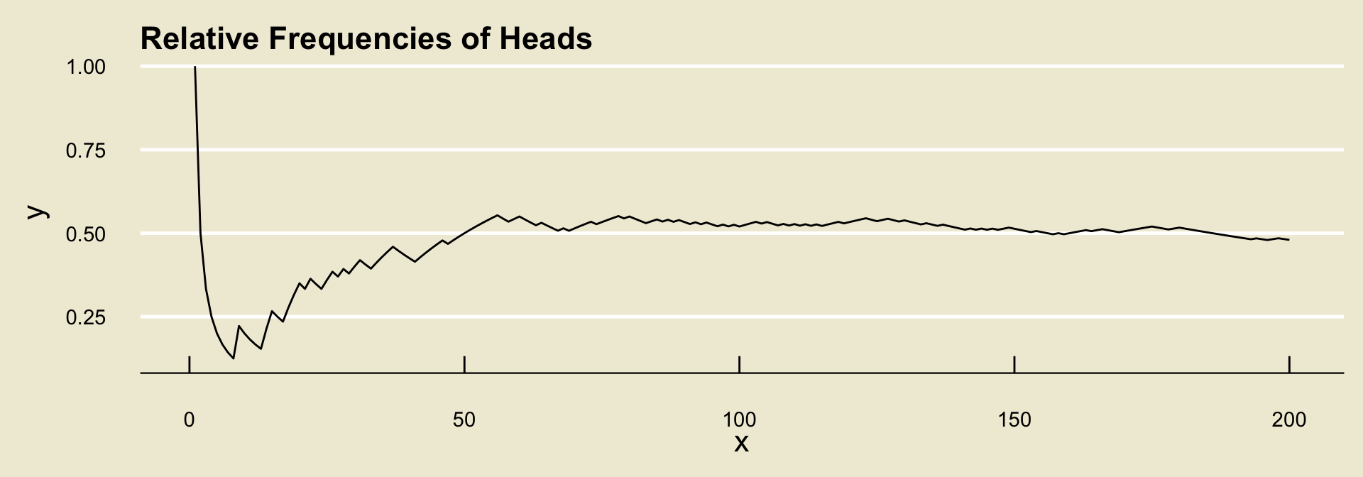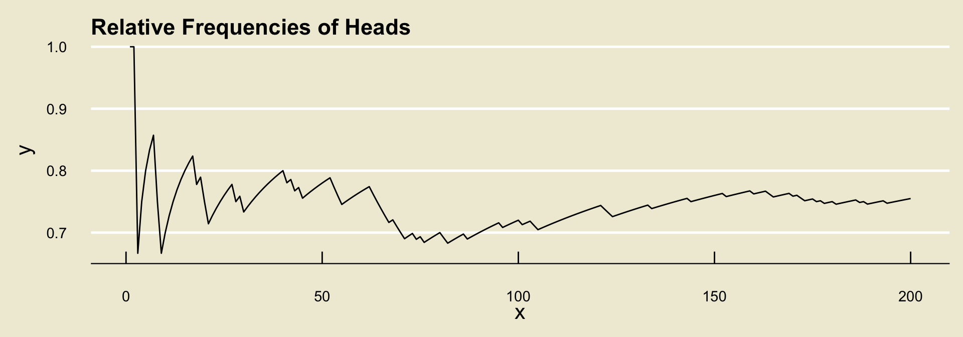 To help us understand the notion of long-run frequencies, let’s go through an example together. Suppose we toss a coin and record whether the outcome lands heads or tails, and further suppose we observe the following tosses:
