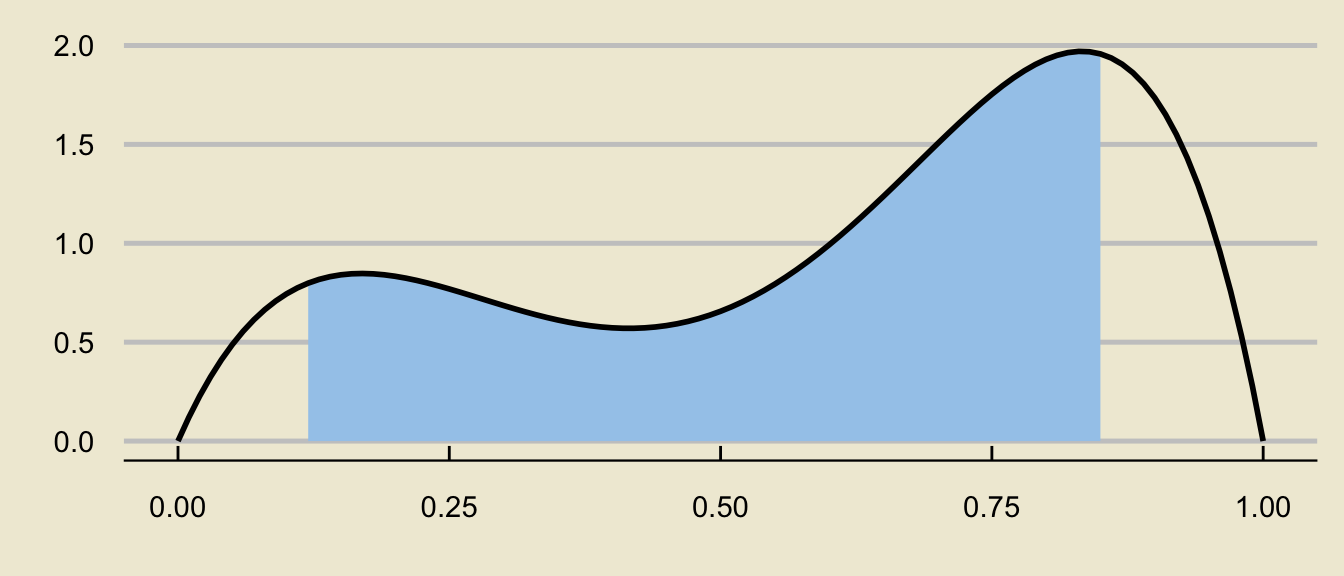 \[ \mathbb{P}(a \leq X \leq b) = \underbrace{\mathbb{P}(X \leq b)}_{\text{c.d.f. at $b$}} - \underbrace{\mathbb{P}(X \leq a)}_{\text{c.d.f. at $a$}} \]